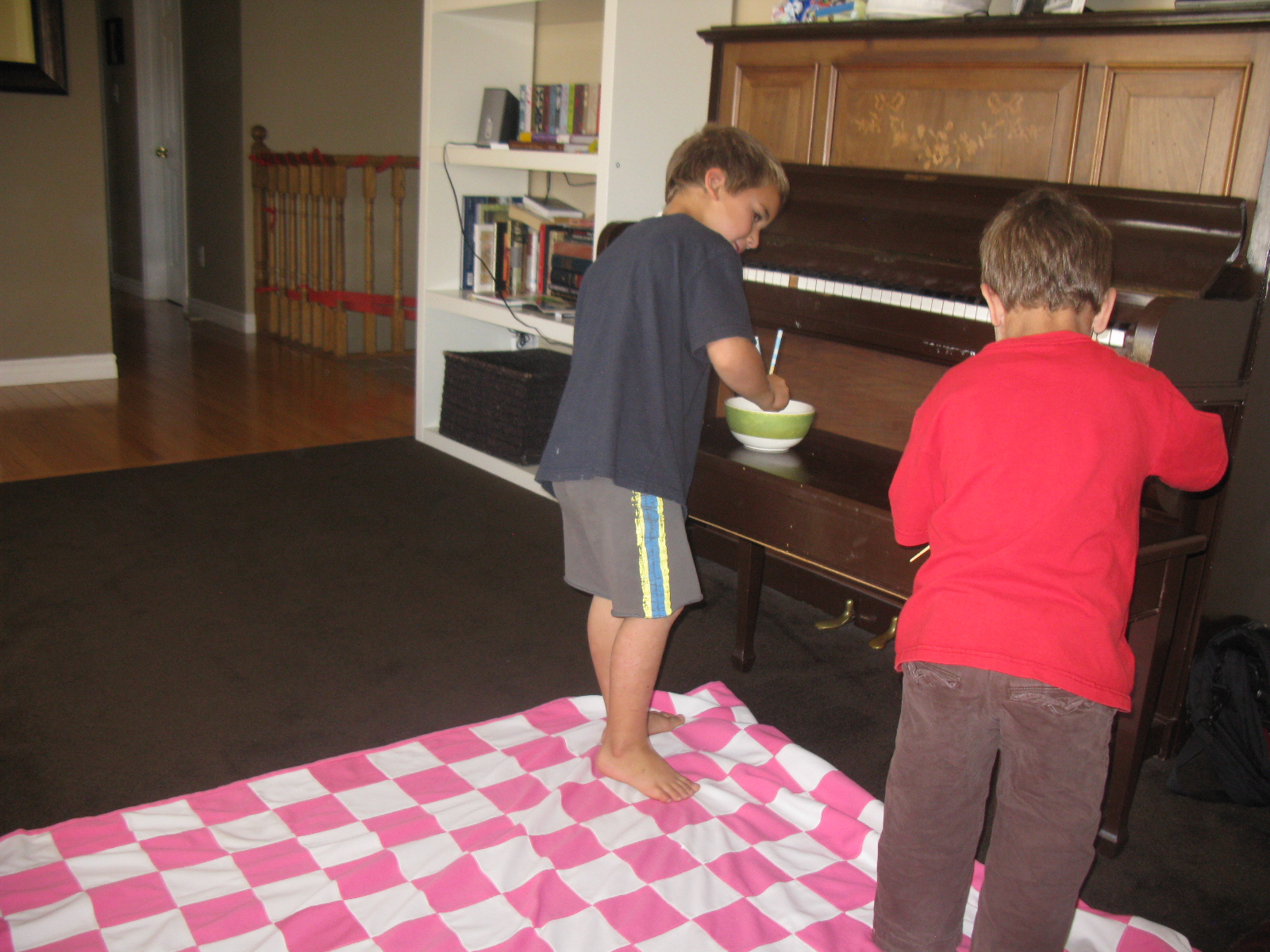 The kids each made a menu. They practiced writing their names in Japanese characters on the front of it. Above is Jane's menu, and below is Charlie's. The menu had 3 types of rice, fish, tofu, and all kind of vegetables for stir fry, soy sauce, ginger, chocolate milk and Jane's lavender ice cream. When the meal was over the kids paid with their Monopoly money that we wrote "Yen" on.