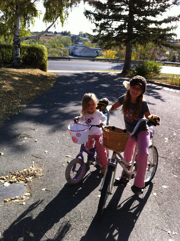 This was a blustery fall morning. The girls packed all kinds of things (dolls, limes, Despereaux, notebooks) in their bike baskets, then went for a ride.